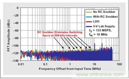5 個實驗的 FFT 曲線圖對比(請參見圖 6)顯示噪聲底限或雜散振幅沒有出現(xiàn) 較大的增加。使用 LDO 清除開關(guān)噪聲使得輸出頻譜看起來幾乎與干凈 5-V 實 驗室電源完全一樣。去除 LDO 以后,我們觀測到從開關(guān)穩(wěn)壓器產(chǎn)生了兩個雜散, 其具有一個來自 10-MHz 輸入音調(diào)的約 500 kHz 頻率偏置。RC 緩沖器電路降 低這些雜散振幅 約 3dB,從約 –108 dBc 降到了約 –111 dBc。這一值低于 ADS5483 的平均雜散振幅,其表明 ADS5483 可以在不犧牲 SNR 或 SFDR 性 能的情況下直接由一個開關(guān)穩(wěn)壓器來驅(qū)動。