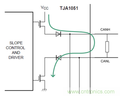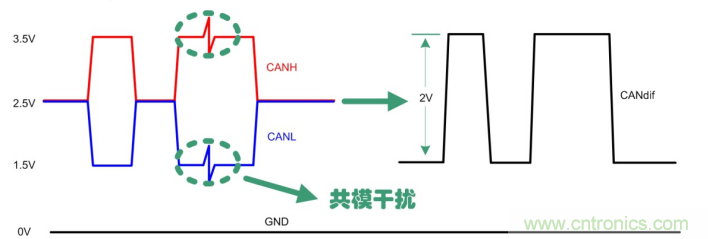 總線固有的差分傳輸形式使得CAN對(duì)于共模干擾有很好的抑制能力,如圖 4所示,通過CANH、CANL相減可很好地消除來(lái)自外部的共模干擾,但CANH、CANL并非理想對(duì)稱,快速上升的跳變沿,這些均會(huì)帶來(lái)EMC問題。我們通過示波器看總線波形很完美,測(cè)試靜電,EFT,浪涌,傳導(dǎo)騷擾抗擾均無(wú)異常。但測(cè)試傳導(dǎo)發(fā)射,則不能滿足限值要求,看起來(lái)很正常的總線實(shí)際卻向外在發(fā)送傳導(dǎo)干擾。