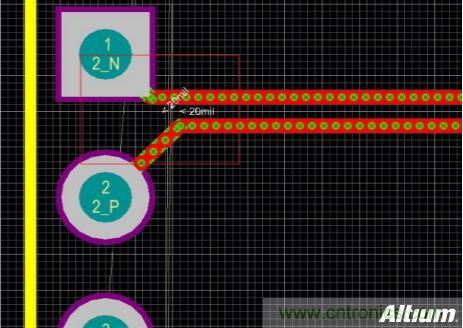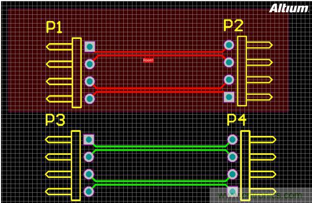 在PCB規(guī)則定義中,比如要對(duì)一塊特定的區(qū)域采用不同的規(guī)則,那么Room是解決這類問(wèn)題的首選。首先用Room框出這一塊特定區(qū)域并命名為Room1。然后在規(guī)則定義里選擇WithinRoom(''Room1'') ,之后可以為這個(gè)Room里的對(duì)象設(shè)置各種規(guī)則。比如下圖所示,線寬規(guī)則全部違反了最小線寬設(shè)定值,所以都有綠色高亮顯示。然后為右邊的區(qū)域框選了Room1,分別為其設(shè)置了較寬的線寬值10mil,那么Room里的線寬符合規(guī)則定義,已經(jīng)顯示正常,沒(méi)有綠色高亮違規(guī)顯示了。但同一根網(wǎng)絡(luò)的