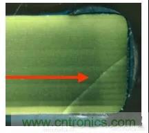 因為MLCC主要成分是陶瓷,在放置元件,分板,上螺絲等工序中,很可能因為機械應力過大導致電容受擠壓破裂,從而導致潛在的漏電失效。此時的裂縫一般呈斜線,從端子與陶瓷體的結合處開裂。
