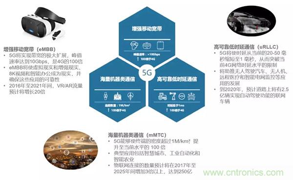 未來(lái)5G將應(yīng)用在增強(qiáng)移動(dòng)寬帶(eMBB)、高可靠低時(shí)延通信(uRLLC)、海量機(jī)器類通信(mMTC)三大場(chǎng)景。而這需求的是非常寬的帶寬,非常高傳輸?shù)乃俾剩浅?煽康牡脱訒r(shí)的連接,另外,還需要海量機(jī)器類型連接的網(wǎng)絡(luò)。