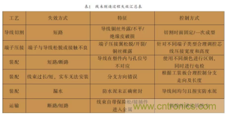 如下表1是線束在制造過程中最常見的失效方式,需在制造的各個環(huán)節(jié)保證線束的制造質(zhì) 量。機(jī)械設(shè)備設(shè)定合理的規(guī)格參數(shù),人工操作建立標(biāo)準(zhǔn)化操作及比對面板,最后對線束進(jìn)行抽查全方位檢測而保證線束的制造質(zhì)量。