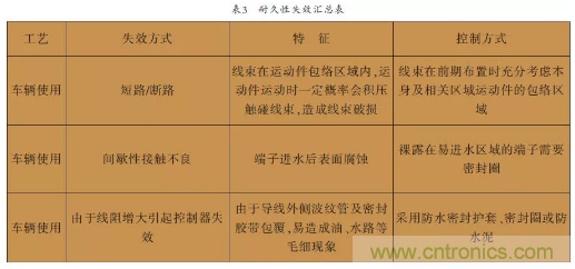 耐久性失效是一種隨著車輛使用,在中間環(huán)節(jié)形成的失效方式,是伴隨著車輛的生命周期隨機(jī)產(chǎn)生的,具有不可預(yù)測性。一旦失效會引起客戶對品牌的極大抱怨。此類失效多為線束在運(yùn)動件包絡(luò)區(qū)域內(nèi)發(fā)生,在達(dá)到一定的磨損后產(chǎn)生的,因此在初期不易察覺。如下表3為耐久性失效匯總表。