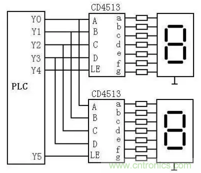 如果PLC使用繼電器輸出模塊,應(yīng)在與CD4513相連的PLC各輸出端接一下拉電阻,以避免在輸出繼電器的觸點斷開時CD4513的輸入端懸空。PLC輸出繼電器的狀態(tài)變化時,其觸點可能抖動,因此應(yīng)先送數(shù)據(jù)輸出信號,待該信號穩(wěn)定后,再用LE信號的上升沿將數(shù)據(jù)鎖存進CD4513。