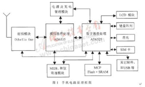 數(shù)字移動(dòng)電話的電路由射頻與基帶兩大部分組成。其中射頻(RF)電路包括收發(fā)器、頻率合成器和功放等,基帶(Baseband)電路包括數(shù)字信息處理和控制器、存儲(chǔ)器、電源管理和其他外設(shè)部分。以ADI手機(jī)為例,其原理框圖如圖1所示。