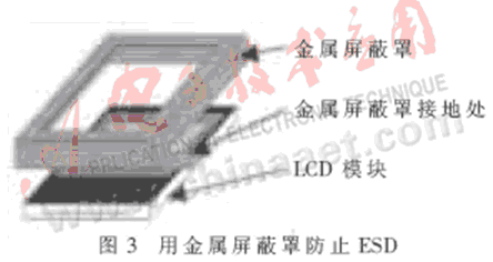 其二,用“疏”的方法。可以用EMI油漆噴涂在殼體的內(nèi)側(cè)。EMI油漆是導(dǎo)電的,可以看成是一個(gè)金屬的屏蔽層,這樣可以將靜電導(dǎo)在殼體上;再將殼體與PCB(Printed Circuit Board)的地連接,將靜電從地導(dǎo)走。這樣處理的方法除了可以防止靜電,還能有效抑制EMI的干擾。如果有足夠的空間,還可以用一個(gè)金屬屏蔽罩將其中的電路保護(hù)起來,金屬屏蔽罩再連接PCB的GND。圖3是用金屬屏蔽罩將LCD模塊保護(hù)起來的例子。