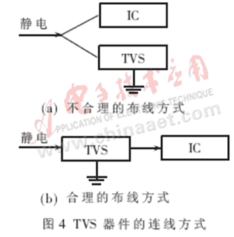 因?yàn)門VS具有體積小、反應(yīng)速度快等優(yōu)點(diǎn),現(xiàn)在的設(shè)計(jì)中使用TVS作為防護(hù)器件的比例越來越多。目前TVS級(jí)間等效電容越做越小,所以適合芯片的保護(hù)。在使用時(shí)應(yīng)注意放在需要保護(hù)的器件旁邊,到地的連線盡可能短,器件的布線應(yīng)成串聯(lián)型,而不能布成并聯(lián)型。如圖4所示。