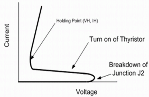 晶閘管的過壓保護(hù)設(shè)備是基于一對雙極性晶體管,這一對雙極性晶體管是由四層不同摻雜的N,P極組成,如圖1所示。N型摻雜的N1,P型摻雜的P1,和N型摻雜的N2分別構(gòu)成NPN晶體管的發(fā)射極,基極和收集極,而P型摻雜的P2,N型摻雜的N2,和P型摻雜的P1分別構(gòu)成了PNP晶體管的發(fā)射極,基極,和收集極。這樣一來一個晶體管的收集極是另外一個晶體管的基極。按這種方法那么一個晶體管的發(fā)射極到收集極流過的電流就是流向另一個晶體管的基極的電流。如果加一個從陽極到陰極的正電壓,那兩個三極管的發(fā)射極與基極之間,即J1和J3,都是正向電壓偏置。只有J2處PN結(jié)形成反向電壓偏置時才能阻礙電流流動。如果從陽極到陰極的電壓增加到大于J2處PN結(jié)的擊穿電壓,電流就開始直接流向兩個雙極性晶體管的基極。這使得兩個三極管都導(dǎo)通,會導(dǎo)致含有兩個三極管的晶閘管的電阻下降,并且晶閘管兩端的電壓也會減小。如圖2所示我們可以看到晶閘管的從陽極到陰極的正電流存在時的電壓-電流曲線。有著這樣的電壓-電流曲線特性的保護(hù)器件一定會有非常優(yōu)秀的保護(hù)特性。當(dāng)保護(hù)器件在觸發(fā)后,工作電壓下降時保護(hù)器件可以承受大的電流并且自身功耗很小。事實上,具有這種電壓-電流曲線特性的保護(hù)器件通常被稱為“消弧”保護(hù)器件,因為這就好比是通過把一個“金屬消弧”放置在需要保護(hù)的端口來實現(xiàn)保護(hù)作用的。值得注意的是只有當(dāng)電流或者電壓降到閾值點以下,才能使得晶閘管回到高阻態(tài),如圖2所示。