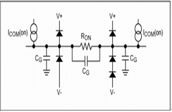 模擬開關(guān)內(nèi)的通道元件通常包括一個或更多的MOSFET,同時還包含有寄生鉗位二極管(鉗位至電源電壓),用于ESD保護。圖1顯示了一個閉合的模擬開關(guān)的等效電路圖。只要V+和V-存在,并且輸入電壓不超過:電源電壓 + 鉗位二極管的正向偏壓(典型0.6V),二極管就處于反向偏置,沒有電流通過。