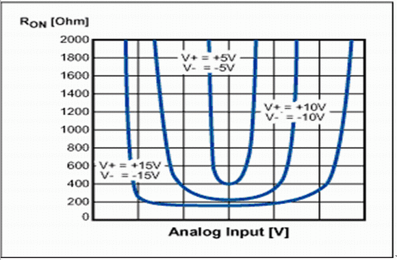 圖4. 早期故障保護開關(guān)的導(dǎo)通電阻隨信號電壓的變化