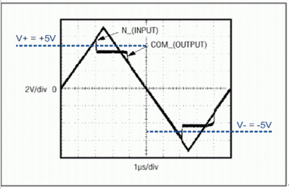 圖6顯示了一個閉合的、具有故障保護的開關(guān)在經(jīng)歷兩個方向的輸入故障電壓期間的輸出情況。通常情況下,在輸入電壓比V+ (或V-)高出150mV約200ns后,輸出(COM)就會等于正(或負)電源電壓減去一個FET的電壓降。當輸入電壓返回到電源范圍以內(nèi)后,需要再經(jīng)過一個700ns (典型值)的延遲,輸出方可恢復(fù)并跟隨輸入。這個延遲和COM輸出端的電阻和電容有關(guān),而和故障電壓的幅度無關(guān)。COM端的電阻和電容越大,恢復(fù)時間就越長。