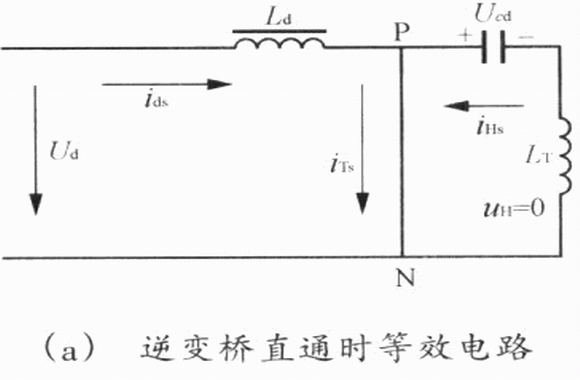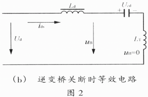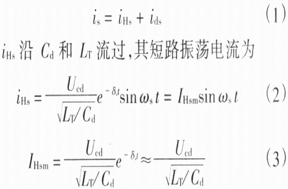 在負(fù)載短路時(shí),逆變橋囚侵入干擾信號(hào)而產(chǎn)生直通短路,逆變橋輸入電壓突降為零。這時(shí),原來儲(chǔ)藏在濾波電感Ld中的磁能和隔直電容Cd中的電能均分別以短路電流ids和iHs的形式向逆變電路釋放,等效電路圖為圖2(a)所示。橋中IGBT流過的短路電流is為