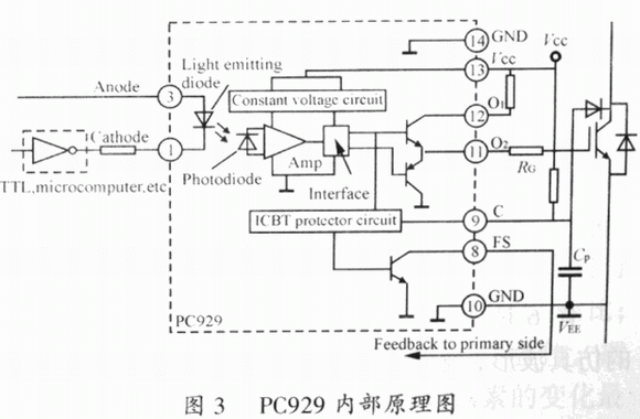 所謂降柵壓慢關(guān)斷技術(shù)指的是,當(dāng)IGBT出現(xiàn)過流時(shí),先將其柵極驅(qū)動(dòng)電壓降低,然后將其關(guān)斷,一是延長了IGBT能夠承受過流的時(shí)間,二是可以降低器件受到過流沖擊的幅度。過流時(shí)器件通態(tài)壓降升高,管子瞬時(shí)熱損耗急劇增加,為防止器件熱損壞,過流時(shí)間應(yīng)足夠短,一般<10μs。SHARP公司的光耦合器PC929將這一功能和驅(qū)動(dòng)電路集成在一起,器件內(nèi)部原理圖如圖3所示。