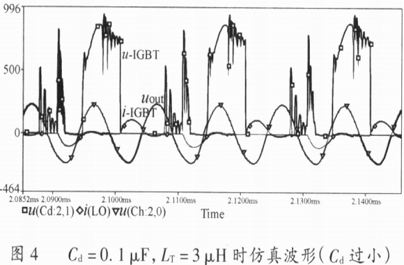 從減小短路電流的角度看,Cd要盡可能小,LT要盡可能大。但Cd過小,電路工作時(shí)存在以下缺點(diǎn):隔直效果不理想;輸出電壓正弦失真度過高,輸出電壓降低,加熱效果不理想;反并二極管重新導(dǎo)通,增加二極管的電流容量,如圖4所示。