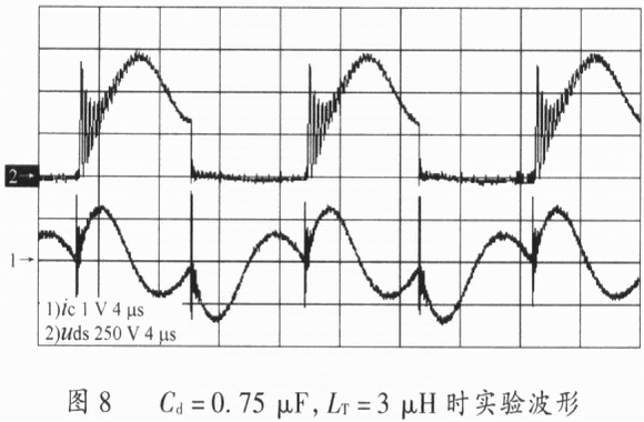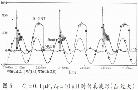 當(dāng)LT過大時(shí),電路工作時(shí)存在以下缺點(diǎn):LT上的高頻壓降過高,使得輸出電壓降低;管子關(guān)斷時(shí)承受的正向阻斷電壓升高;內(nèi)槽路諧振頻率減小,IGBT和二極管出現(xiàn)二次導(dǎo)通,如圖5所示。