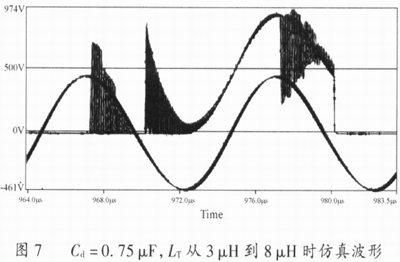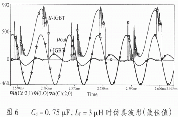 圖6是LT/Cd=4,Cd=0.75μF,LT=3μH時(shí)的仿真波形,通過與圖4和圖5的對比可以看出,此時(shí)參數(shù)選擇最為合適。