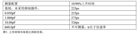 上升和下降時間較慢會給系統帶來一些問題,其中最重要的是時序問題。電路在特定的時間需要穩定的“高”態和“低”態。隨著各狀態之間過渡時間的增加,電路有可能檢測到不完整的過渡期,從而將數據誤差引入系統。表1是不同寄生電容ESD抑制器件對數據上升沿時間(10%至90%高電平)所造成的影響比較。