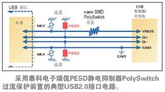 圖7.采用泰科電子瑞侃PESD靜電抑制器和PolySwitch過流保護裝置的典型USB2.0接口電路。