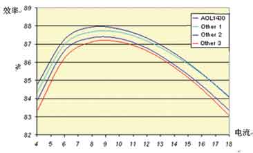 注意到圖2中,除了柵極結(jié)構(gòu),其他的部分就是標準的采用Trench工藝的MOSFET。柵極被分割成上下兩個部分,下部分用一些特殊的材料屏蔽起來,下部分在內(nèi)部和上部分的柵極相連,而柵極的屏蔽層被連接到源極,從而減小漏極柵極米勒電容。用這種技術(shù)設計的MOSFET如AOL1464,其Vds為30V,Vgs在10V條件下Rds(on)為6.2mΩ,而其Crss只有20pF,極大地減小了開關(guān)過程中米勒平臺的持續(xù)的時間,降低了開關(guān)損耗。AOL1430,其Vds為30V,Vgs在10V條件下Rds(on)為2.5mΩ,而其Crss為50pF。圖3中,下管采用AOS的AOL1428,上管采用AOL1430和其他廠家目前Crss最低的器件的效率曲線,可見,上管采用AOL1430具有非常高的效率。注意:輸入電壓12V,輸出電壓 1.7V,開關(guān)頻率300kHz。