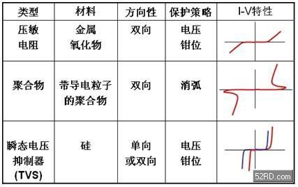 安森美半導(dǎo)體來自美國的ESD保護(hù)專家RobertAshton博士說,一般而言,ESD保護(hù)元件的分類可以通過其保護(hù)策略與方向性來進(jìn)行,主要包括壓敏電阻、聚合物和瞬態(tài)電壓抑制器(TVS)等,如表1所示。在這幾種保護(hù)元件中,壓敏電阻在低電壓時,呈現(xiàn)出高電阻,其中的每個小型二極管兩端的電壓都相當(dāng)?shù)停瑫r電流也相當(dāng)小;而在較高電壓時,其中的獨(dú)立二極管開始導(dǎo)通,同時壓敏電阻的電阻會下降。從表1中我們也可以看出壓敏電阻為雙向保護(hù)元件。而對于帶導(dǎo)電粒子的聚合物而言,在正常電壓下,這些材料擁有相當(dāng)高的電阻,但當(dāng)發(fā)生ESD沖擊時,導(dǎo)電粒子間的小間隙會成為突波音隙陣列,從而帶來低電阻路徑。