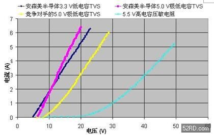結(jié)合ESD脈沖測試和TLP測試,我們可以得出結(jié)論,在不同ESD保護(hù)元件中,TVS元件,特別是安森美半導(dǎo)體的TVS元件的大電流導(dǎo)電率極佳,且在重復(fù)應(yīng)力條件下仍能維持優(yōu)異性能,不存在壓敏電阻或聚合物那樣的使用增多后會出現(xiàn)性能下降的問題;至于其在電容方面的不足,也隨著新的低電容設(shè)計(jì)的出現(xiàn),而消除了早前的大電容問題。