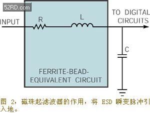 一種可在電路輸入級使用的簡單的ESD瞬變抑制技術,就是將一個磁珠串在輸入引線上,并在輸入引線和地之間接一只容量很小的電容器。圖2示出了磁珠的等效電路。輸入端的LC電路起濾波器的作用,將ESD瞬變的能量分流入地。當使用瞬變抑制二極管保護任何輸入端或輸出端時,要使瞬變抑制器盡量靠近這些端子。很長的導線和電路板印制線都有寄生電感,當ESD瞬變脈沖進入電路時,寄生電感就會產生電壓過沖與振鈴問題。