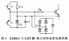 圖5所示為EXB841與IGBT柵-射極之間的連接電路原理圖。當驅動電路中的V4導通時,IGBT處于正常導通狀態,當V5導通時,IGBT柵-射極之間通過穩壓管VZ2提供一個-5V電壓加在其兩端,使IGBT關斷,此時V5處于臨界導通狀態,穩壓管VZ2處于反向偏置狀態。但由于集-柵極之間分布電容的影響,集-柵極之間的du/dt增大時,其通過分布電容形成的電流經過,所以,要克服集-柵極之間的du/dt,確保穩壓管不過壓,避免IGBT誤導通。克服du/dt的方法有二種:一是驅動電路輸出與IGBT柵-射極之間的連線采用雙絞屏蔽電纜,屏蔽層接地,二是采用快速吸收電路吸收過電壓。