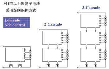 上面提到的電池保護芯片最多能保護4節鋰離子電池,然而很多應用都需要5~12節鋰離子電池串聯工作,比如電動工具、電動自行車和UPS,此時又如何解決呢?答案很簡單,就是同時使用多個鋰電池保護芯片。如圖1所示,兩個保護芯片串聯在一起,由2個N溝道MOSFET做控制開關,可以保護8節鋰離子電池,三個保護芯片串聯在一起,就保護了12節鋰離子電池。這種多保護芯片的串聯就是保護芯片的“級聯”。以S-8204B為例,兩個S-8204B聯合使用,用2個N溝道MOSFET在低壓側端進行控制,這樣通過單顆IC可選3節和4節的功能就可以實現對6~8節串聯鋰離子電池的保護。如果是5節鋰離子電池串聯,則可以使用一個S-8204B與其他鋰離子電池保護芯片串聯,實現保護功能。這種多保護芯片的靈活組合,可以完成對任意數目鋰離子電池的保護。