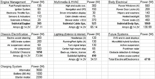 關于該表要注意的最后一點是:如果考慮車身電子、照明和底盤電子等子系統的間歇性負載,對汽車充電系統的需求就真的是附件超載(accessoryoverload)。將來的系統將持續這種趨勢。