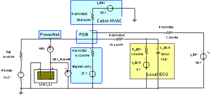 在上圖中,汽車充電系統由交流發電機和鉛酸電池來表示。在這種情況下,要利用Ansoft公司的汽車工具箱之中的Simplorer電化學建模工具對電池進行比較詳細的建模。PowerNet被高度簡化為由線規電阻建模的四個分支電路,包括引擎控制、車箱氣候控制、本地ECU和EPS(最右邊)。PowerNet分配點被標注為PDB或電力分配箱。