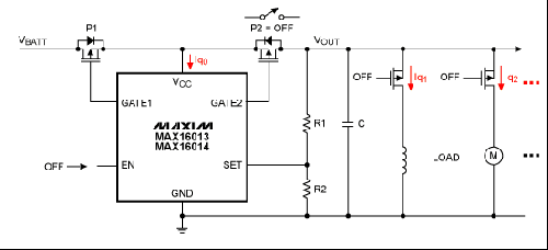圖9.MAX16013/MAX16014用作主開關控制,在ECU關閉時有助于降低靜態電流損耗。