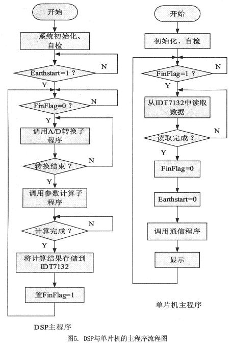 FinFlag為計(jì)算完成標(biāo)志。外部輸入的電壓、電流信號(hào)經(jīng)過(guò)輸入轉(zhuǎn)換電路變?yōu)榈蛪盒⌒盘?hào),經(jīng)過(guò)平移電路和信號(hào)調(diào)理,成為可以直接被A/D轉(zhuǎn)換的采樣信號(hào),輸入A/D轉(zhuǎn)換器。DSP芯片從A/D的寄存器中讀取數(shù)據(jù)。當(dāng)所有的轉(zhuǎn)換都結(jié)束時(shí),DSP啟動(dòng)數(shù)據(jù)處理程序,即應(yīng)用小波分析對(duì)數(shù)據(jù)進(jìn)行分析和計(jì)算。計(jì)算完成后,將計(jì)算結(jié)果存儲(chǔ)在雙口RAM中,并把FinFlag標(biāo)志置1。當(dāng)單片機(jī)查詢到此標(biāo)志為真時(shí),啟動(dòng)數(shù)據(jù)讀取程序,從雙口RAM中讀取DSP已經(jīng)運(yùn)算完成的數(shù)據(jù)。當(dāng)讀取完成時(shí),F(xiàn)inFlag和Earthstart標(biāo)志都置為0,然后完成顯示任務(wù)和串行通信任務(wù)。系統(tǒng)等待下一次接地故障的發(fā)生。