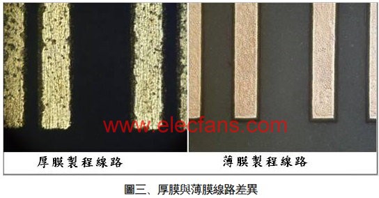 圖(三)即為璦司柏薄膜基板產品與傳統厚膜產品的金屬線路光學顯微圖像。可明顯看出厚膜印刷之線路,其表面具有明顯的坑洞且線條的平整度不佳,反觀以薄膜工藝制備之金屬線路,不但色澤清晰且線條筆直平整。