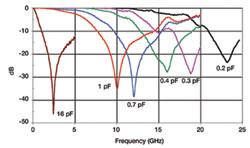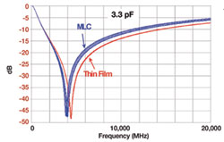 薄膜電容器(如圖1所示)還具有一項(xiàng)前面沒(méi)有提及的性能優(yōu)勢(shì):它的響應(yīng)只有1個(gè)諧振點(diǎn),因?yàn)檫@種器件使用單絕緣層設(shè)計(jì)封裝成多層陶瓷電容器(MLCC)。圖2顯示了這種薄膜電容器的部分S21前向傳輸損耗特性曲線。