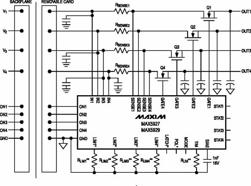 Maxim公司推出了一系列電源熱插拔控制器,適應于各種背板電源的要求。MAX5927/5929是針對低壓電源系統的+1V到13.2V的四通道熱插拔控制器。在電路板熱插拔時,MAX5927/5929控制輸出電壓緩慢升高,同時限制輸入電流小于預設值,避免瞬態大電流沖擊,保證了系統的安全性和穩定性。圖1是典型應用電路圖,圖2是熱插拔時的啟動電壓、電流波形??梢钥闯觯琈OSFET的柵極電壓受MAX5927/5929的控制,按照固定斜率上升,逐漸打開MOSFET,輸出到電路板的電壓也基本同步地按斜率上升,瞬態電流則始終被控制在門限值以內,避免了大的沖擊電流的出現。啟動時間和電流限值都可以簡單地通過一個外部電阻來設定,為設計工程師提供了極大的靈活性。