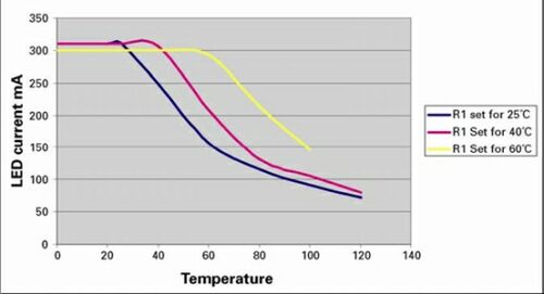 圖1中曲線顯示了1WLED的典型性能下降特性。正如所期望的那樣,這清楚地表明,被恒定電流驅(qū)動的LED在到達(dá)某一點后,該恒流需要線性地減少,直到在150℃這一點上達(dá)到0。恒流下降點和減小斜率取決于機械/散熱安排。