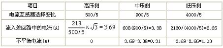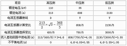 實例:一臺三相三繞組降壓變壓器,容量Se=40.5MVA,電壓110±2×2.5%kV/385±2×2.5%kV/11kV,接線方式:Ydd11-11,變壓器額定電流:213A/608A/2130A。主變差動保護采用BCH-2型差動繼電器。基本計算如表1所示,已確定110kV側為基本側。