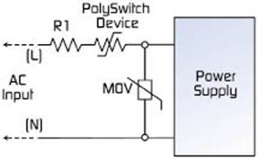 - 將PPTC器件與MOV組合在一起安裝于AC輸入的初級