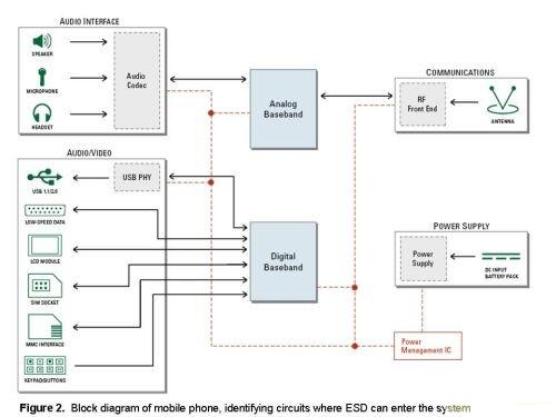 由于手機(jī)的設(shè)計(jì)對象是大眾消費(fèi)者,而且可在任何環(huán)境中使用,因此ESD很有可能會進(jìn)入其中的一個(gè)端口或I/O接口,并導(dǎo)致芯片組出現(xiàn)電氣不穩(wěn)定現(xiàn)象或完全損壞。圖2用于幫助說明不同電路該用什么樣的ESD保護(hù)技術(shù)。它表明,所有的電路都有可能為ESD進(jìn)入手機(jī)提供一個(gè)途徑。