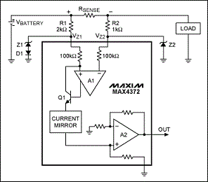 圖1給出了一個過壓保護例子,由齊納二極管Z1和Z2、電阻R1和R2以及二極管D1組成。MAX4372放大器的共模電壓范圍為0至28V,足以測量6V至18V范圍的汽車電池電壓。但是,拋負載電壓可能達到35V,而且會持續0.5秒,恰好超過了放大器的30V最大額定輸入電壓,必須通過外部電路保護放大器。