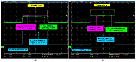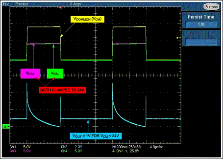 圖2是當移走D1時,35V拋負載脈沖下放大器的輸出。施加電壓為電池標稱電壓,所要求的輸出電壓為1V(輸入VSENSE=50mV、增益=20)。出現拋負載電壓時,齊納管把輸入共模電壓鉗位在大約24V,放大器輸出經過幾個短暫的波動后穩定到0V。