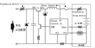 便攜式醫(yī)療電子產(chǎn)品也常常需要充電,充電的保護也可以通過PolySwitchTM元件完成。下圖就是充電器中PolySwitchTM元件的應(yīng)用。虛線框內(nèi)是電池組,PolySwitchTM元件在其中作充、放電過流保護。