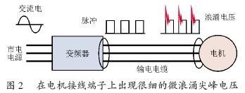 微浪涌電壓是變頻器和電機之間的接線長度很長時,在電機接線端產生的極細的尖峰浪涌電壓。如圖2所示,逆變器的輸出電壓是脈沖狀,在電機接線端子上發現在脈沖狀的波形上又疊加了微浪涌電壓尖峰。一般情況下,微浪涌電壓的尖峰值將會是逆變器內部的直流電壓的2 倍。