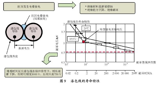 在電機的制造過程中,漆包線線圈的起頭到末尾完全分離不易做到,多數情況下是亂繞的,槽里邊線頭和線尾可能緊挨著。如果這樣就會發生線匝之間由于微浪涌電壓的電暈放電(局部放電)。那怕放電部分時間極其短促,局部也會達到10 000益,高溫使絕緣逐漸地侵蝕,過些時間之后絕緣就會被破壞。如圖9 所示為直徑0.85 mm、漆皮厚33 滋m、F 級絕緣、155益漆包線的壽命特性。