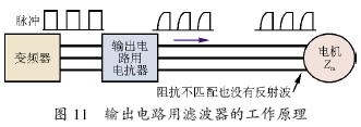 輸出濾波器的工作原理如圖11所示。微浪涌電壓是變頻器輸出脈沖上升時間出現的dv/dt 過大所引起,又由于阻抗不匹配被反射而發生。因此輸出電路使用濾波器,用于抑制dv/dt,也就是抑制了高頻成分因阻抗不匹配而造成的微浪涌。所以輸出濾波器是dv/dt抑制型濾器,這種濾波器在變頻器的調制頻率為15 kHz、接線長度為400 m時,能做出微浪涌電壓1 000 V以下的性能非常優良的產品。不過,這種方式的濾波器為了讓逆變器的輸出電流通過電抗器,不得不做成大容量,造成濾波器的大型化、高價格化、大重量,有的達到50 kg以上,給用戶造成了實際負擔。