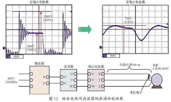 圖12 顯示了供電電源440 V,功率為3.7 kW的變頻器供電給電機(3.7 kW,400 V),在接線長度為100 m時、測量電機接線端子U-V 之間的微浪涌電壓的抑制效果。在沒有輸出濾波器的情況下,微浪涌電壓達到1 360 V,相當于變頻器內部直流電壓680V 的200%。有輸出濾波器的時候,頂峰值電壓是756 V、相當于變頻器器內部的直流電壓680 V的111%,它和沒有輸出濾波器的頂峰電壓差距有604 V,抑制效果達89%。