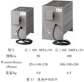 圖13 所示為浪涌抑制組件的外觀。和輸出濾波器相比,浪涌抑制組件是小型化的產品。其技術指標為相間的微浪涌電壓1 000 V以下,防護等級為IP20。浪涌抑制組件是對變頻器的容量不需要選擇,而接線距離需要選擇的產品。另外,接線方法非常簡單,只需要把浪涌抑制組件的輸入電纜接到電機接線端子U、V、W上。
