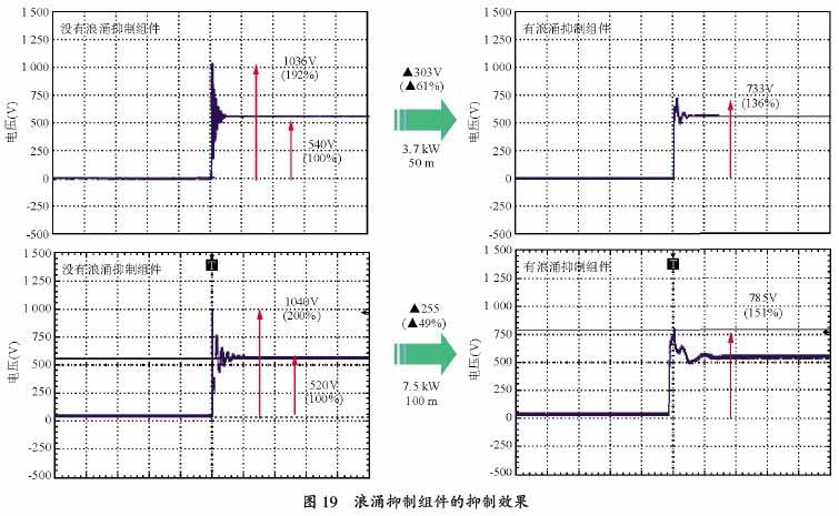 圖19 是變頻器的電源電壓為400 V,3.7 kW的電機、接線長度50 m,和75 kW的電機、接線長度100 m時抑制微浪涌電壓的效果。對于3.7 kW的電機,當沒有浪涌抑制組件時,微浪涌電壓為1 036 V,相當于變頻器內部的直流電壓540 V的192%;當加了浪涌抑制組件時,50 m電纜的峰值電壓為733 V,相當于變頻器內部的直流電壓540 V的136%。電壓尖峰差距303 V,有61%的抑制效果。對于75 kW的電機,當沒有浪涌抑制組件時,微浪涌電壓為1 040 V,相當于變頻器內部直流電壓520 V的200%;當加了浪涌抑制組件時,電纜的峰值電壓為785 V,相當于變頻器內部直流電壓520 V得151%。電壓尖峰差距255 V,有49%的抑制效果。