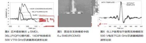 已經在三種條件下使用6 μSMD 裸片來進行CDM測試:僅器件本身、器件貼裝在14DIP轉換板上,以及在36LLP替代板(Surrogate Board)上,如圖3所示。圖4顯示了這三種條件下以500 V電壓采用8 GHz示波器所獲得的CDM測試波形。這些結果顯示,貼裝在電路板上會增加施加給集成電路的應力。36LLP替代板上應力的增加頗為適度,可以視為易于操作性與更可靠測試結果之間的最佳折衷。貼裝在14DIP轉換板上的應力增加更為嚴重,大概不是一個可接受的折衷辦法。好消息是36LLP替代板實際上比測試期間會移動的14DIP轉換板更易于操作。