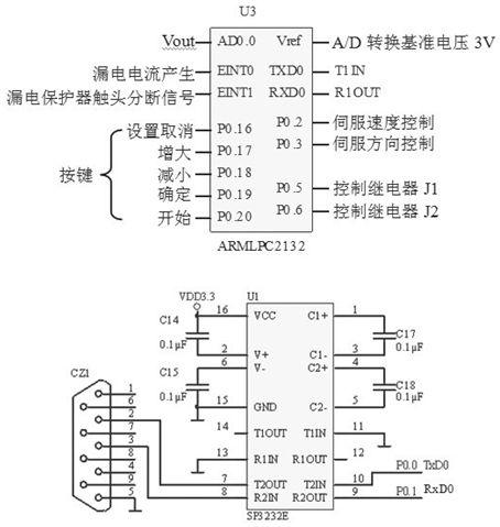 由于A/D轉換為10位,當輸入電壓為5V時,輸出數據值為1024(4FFH),因此最大分辨率為0.0049V(5V/1024)。若產生測試電流的回路電阻為12Ω時,漏電電流的分辨率為0.4mA(0.0049V/12Ω),完全滿足測試需要。漏電保護器的漏電電流產生的開始信號和動、靜觸頭斷開信號分別送入LPC2132的外部中斷輸入端,采用中斷的方式對漏電保護器動、靜觸頭的分斷時間進行檢測。P0.5與P0.6腳分別控制繼電器J1、J2的閉合和分斷,選擇三種不同測量范圍的測試電流。LPC2132與上位機之間采用串行通信,由于系統是3.3V系統,所以要使用SP3232E進行RS-232電平轉換。SP3232E是3V工作電源的RS-232轉換芯片。A/D轉換及控制電路如圖4所示。